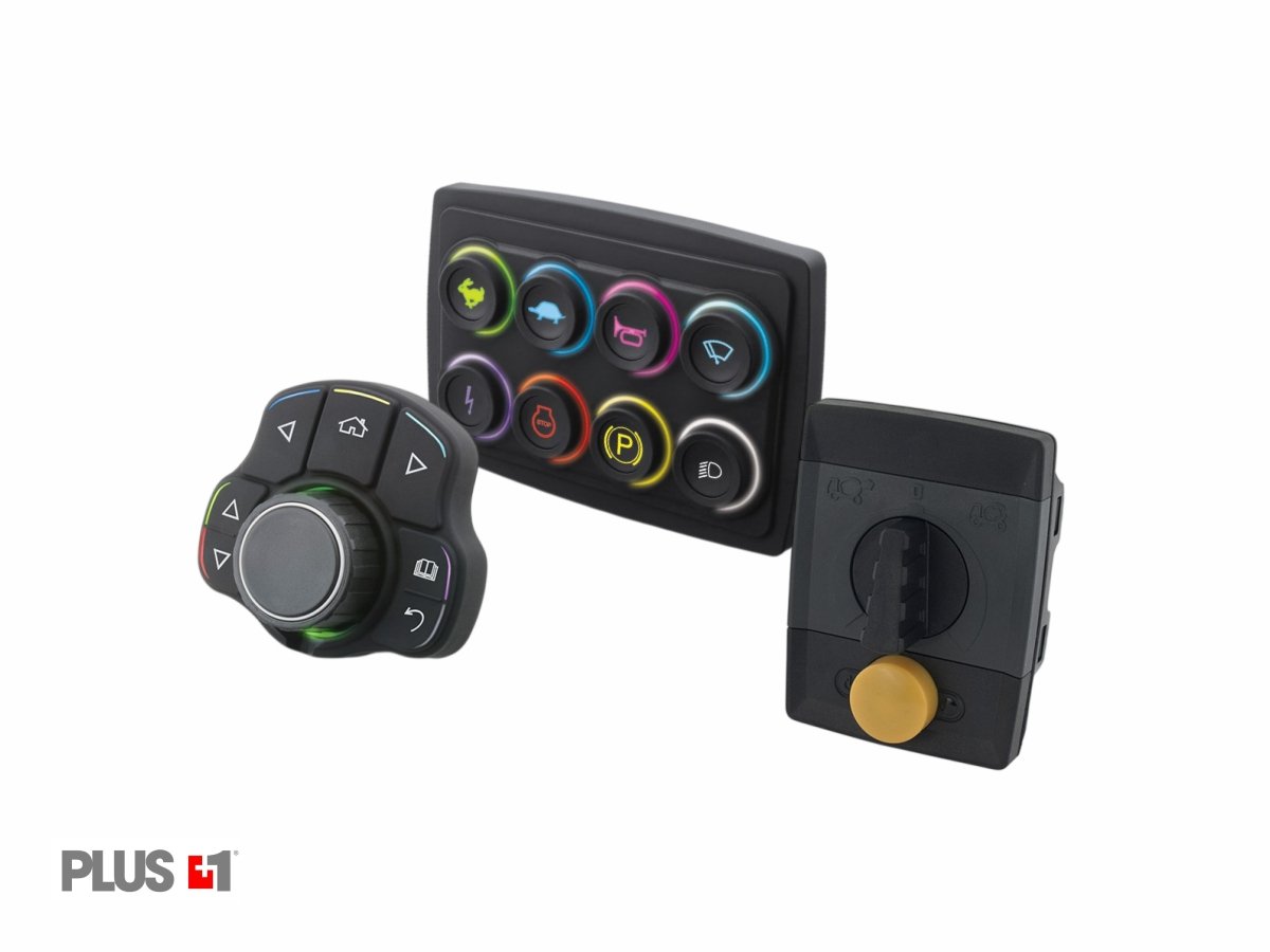 Danfoss Human Machine Interface (HMI) CAN-based devices, such as HMR (Human Machine, CAN Rotary) and HMC (Human Machine, CAN Control). They combine ergonomic, modern and rugged into compact solutions for both open and enclosed cabs.